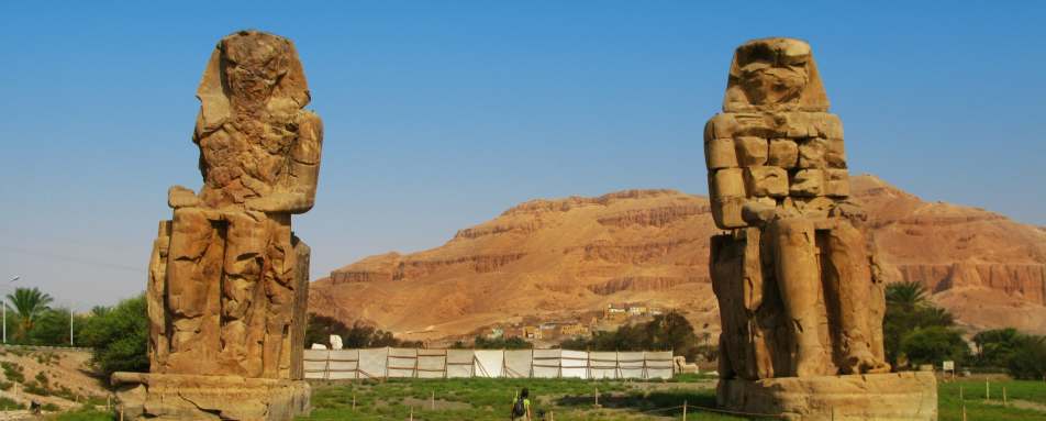 The Colossi of Memnon are two huge stone statues, which are all that remains of the Temple of the hedonistic Amenophis III.