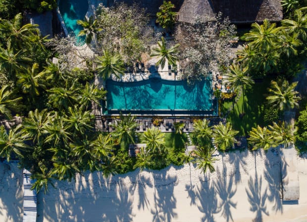 Set on the beach, villas and bures nestle in a beautiful tropical landscape