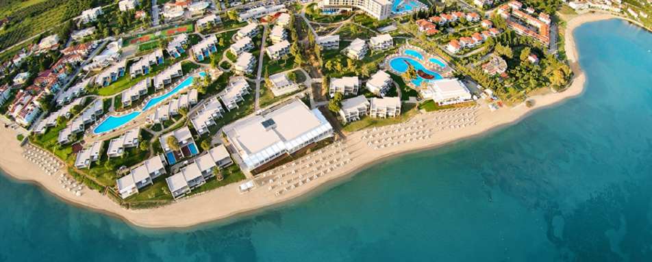 Unfurl into this Greek paradise on the Kassandra Gulf in Halkidiki, an oasis of calm surrounded by the azure waters and 22 acres of verdant landscaped gardens and olive trees. Spend time soaking up the sun in at one of the four deluxe pools, or at the stunning white sand beach and shallow waters perfect for a gentle dip or some watersports fun.