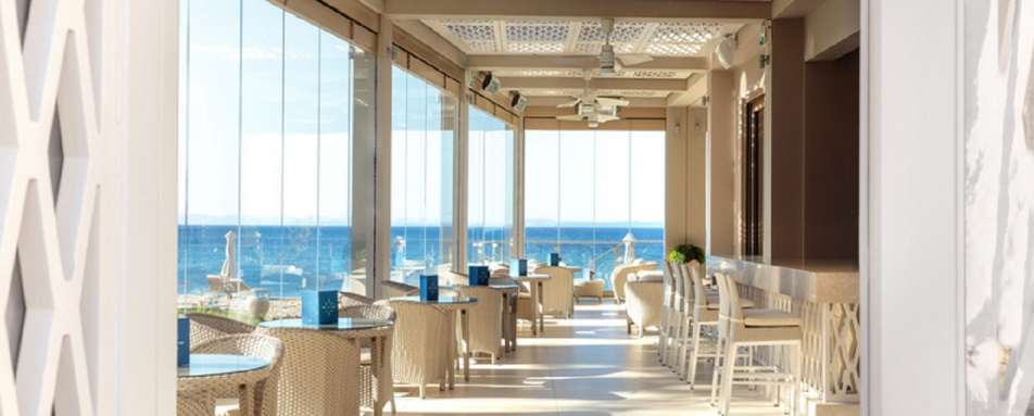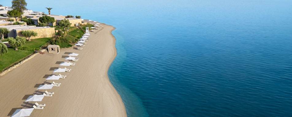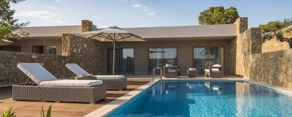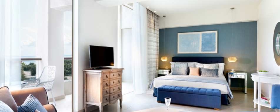 The resort boasts sleek contemporary accommodation, with the interior design creating a tranquil haven to relax at the end of the day. The spacious rooms and suites are in the main building and the bungalows are dotted throughout the grounds. The many rooms and suites are decorated in neutral tones, with sandstone tiles and light furnishings, with floor-to-ceiling windows that overlook the gardens, pools or dazzling sea, you are spoiled with opulent views as you soak up the Greek sun or watch the sunset over the horizon.