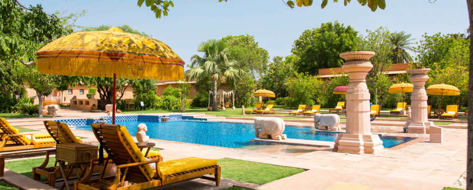 The Oberoi Rajvilas' Luxury Tent measures 45sqm each surrounded by a private garden. The tent features an elegantly appointed bedroom with a king size bed, a dressing area with two closets, a four fixture bathroom with a free-standing claw footed bathtub opening onto the private patio with lounge beds. The interiors of the tents are beautifully appointed with block printed and hand embroidered fabrics and timber flooring. Each tent offers a private terrace and a garden around the perimeter surrounded by a traditional Rajasthani mud wall.