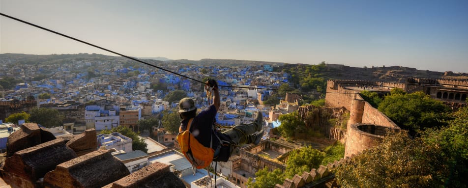 Day 10: Independence Day – Fort & FlightParents explore Mehrangarh Fort in depth, wandering palaces, courtyards, and centuries of history, while teens enjoy a highlights tour that sparks curiosity before breaking away for their Independence Day: teens strap into harnesses and soar across the fort’s massive walls on a zipline, racing over blue-roofed houses with breathtaking views of Jodhpur below. Parents continue their guided exploration or relax at a nearby café, sipping coffee with the fort as a backdrop. The day blends history, adrenaline, and relaxation, an unforgettable way for every family member to experience the grandeur and energy of Jodhpur.