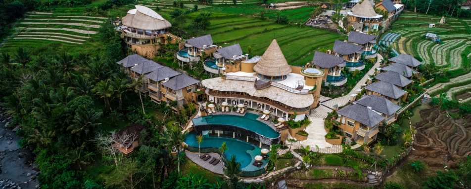 Set amongst the lush green hills of central Bali, Wapa Di Ume Sidemen offers a glimpse into a quieter side of the island and its stunning countryside, with views of the mighty Mount Agung.