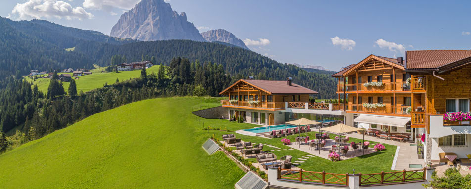 With spectacular views of the Dolomites, Chalet Sellaronda is an exclusive hideaway, offering luxurious living within the privacy of a chalet combined with the boutique services of the adjacent hotel, offering upscale interiors and a private spa.