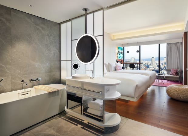 The 337 rooms and suites have attractive clean lines, floor-to-ceiling windows overlooking the Osaka skyline, comfortable seating areas, plush beds, ambience lighting, 55in plasma TVs, mini fridge, and spacious bathrooms with rain showers. The neutral color scheme is enlivened with pops of color, including emoji pillows. Wonderful and Spectacular Rooms are located on the higher floors with better views and have the added benefits of both rain showers and bathtubs, a W MixBar and Bluetooth speaker. Suites include separate bedrooms, while the Extreme Wow Penthouse Suite offers five-roomed opulence, where guests can soak in a champagne-bucket bathtub, spin discs in the DJ Booth and relax in a Zen-inspired Garden.