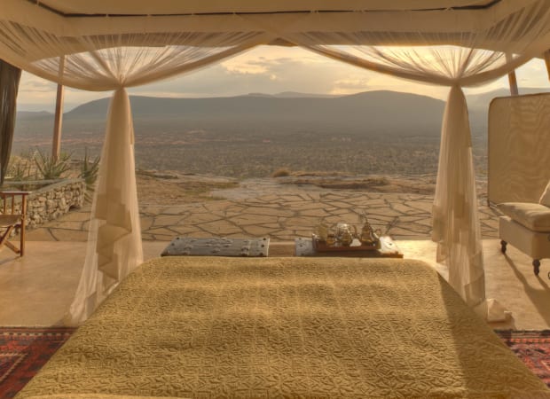 Saruni Samburu has two one-bedroom villas and four two-bedroom villas, all with large verandahs to drink in the stunning views, en-suite bathrooms and outdoor showers looking over the reserve. The whole lodge has been cleverly built into the smooth rock and feels like an organic part of the landscape. Views stretch for miles, all the way to the Matthews Range in the distance.
