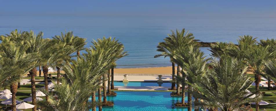 Al Bustan Palace, a Ritz-Carlton hotel is set on a private beach within acres of lush gardens, surrounded by the Gulf of Oman and the Haijar Mountains.