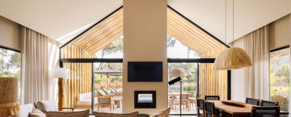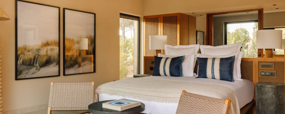 Set within 67 acres of pine and cork forest, the property now comprises 23 rooms and suites and a total of 65 private villas. Accommodations are thoughtfully integrated across the estate, each featuring private terraces and floor to ceiling windows that embrace the landscape. The design is minimalist and elegant, combining soft white tones, natural wood, and refined comfort.