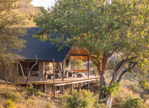 Each of the six spacious tented rooms are nestled into ebony trees along the banks of a water course and have private decks with hammocks. Interiors boast inviting draped beds and en-suite facilities including indoor and outdoor showers and inviting claw footed Victorian baths.
