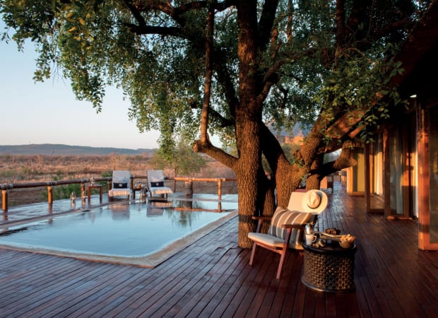 The glass-fronted suite at Little Madikwe Hills is nestled amongst huge boulders and age-old Tamboti trees with beautiful views of the reserve.