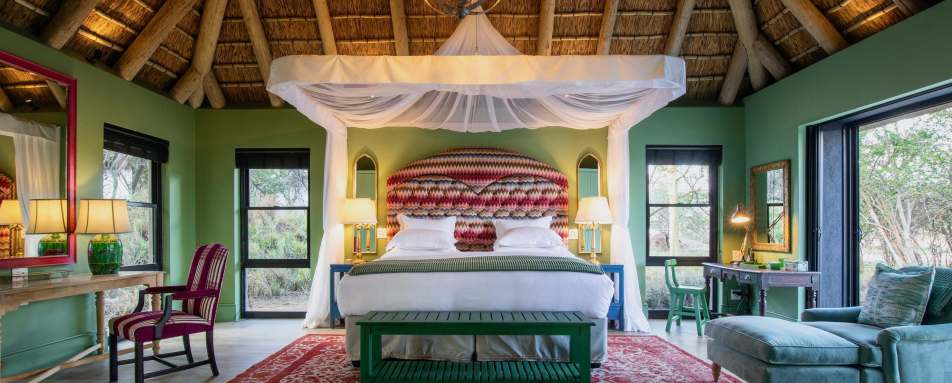 Part of the Royal Portfolio, a collection of South African hotels operated by the Biden family, Waterside at Royal Malewane is a 12-bedroom luxurious safari lodge in Kruger’s Thornybush Game Reserve. The emphasis at this exclusive getaway is on privacy, service, and superlative game viewing. Set amid a forest of ornamental fever trees teeming with colorful birdlife, waterside boasts a glimmering waterhole that attracts the local wildlife. Designed to blend in with its natural surroundings and to maximize the views of the expansive waterhole, this family-friendly safari lodge features free-standing, generously sized and beautifully appointed suites for up to 16 guests, as well as a private villa sleeping up to 8 guests. The opulent interiors feature rich colors, textiles, and textures, reflecting both the peace and drama of the bush, making a stay here an immersive and memorable experience.