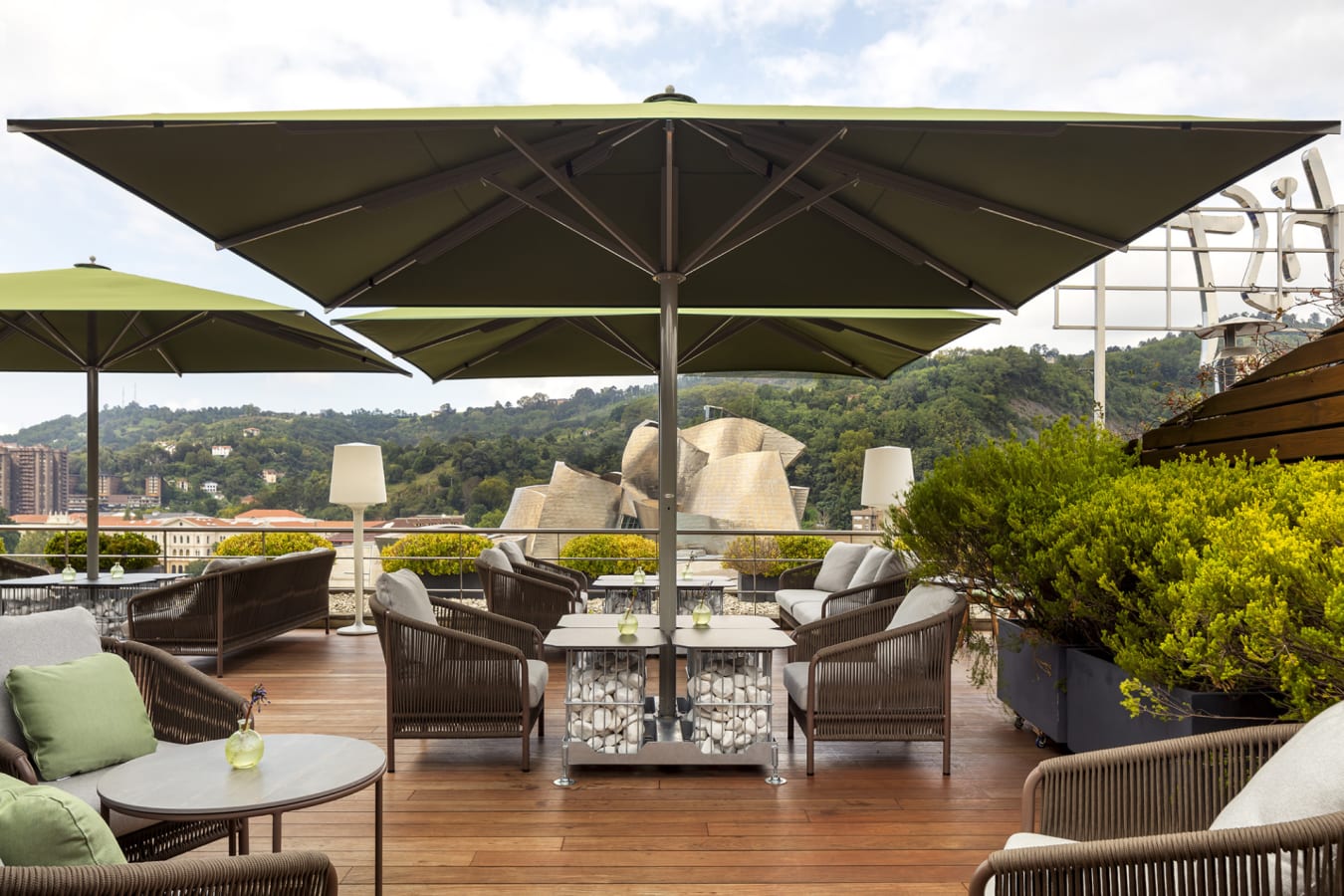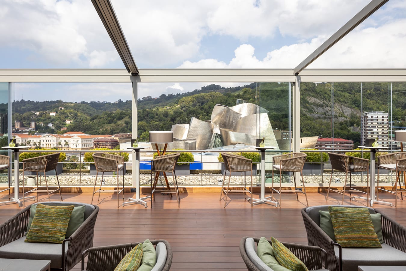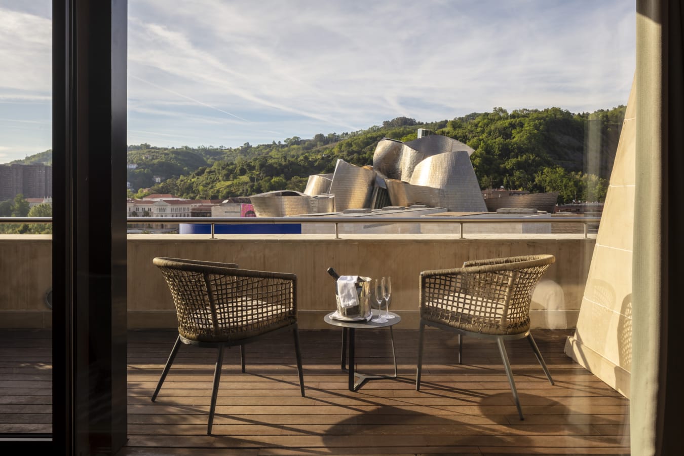 The rooms are contemporary in style, inspired by the Guggenheim, and 54 of these boast views of the museum from the expansive windows. The other rooms have city views, some with a terrace, and a number have Philippe Stark-designed bathtubs and White Company amenities. Crisp, white cotton linens and bright accent colors create a welcoming space to relax after a day exploring Bilbao’s many attractions.