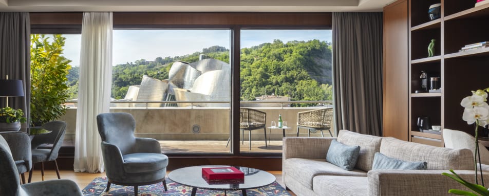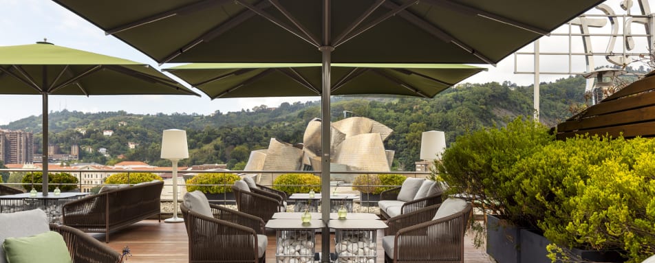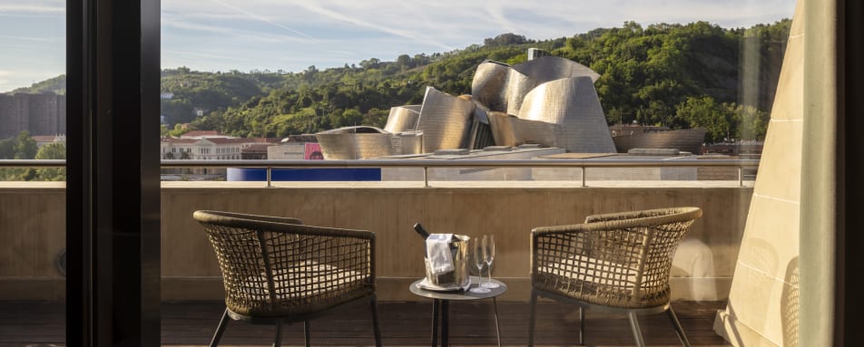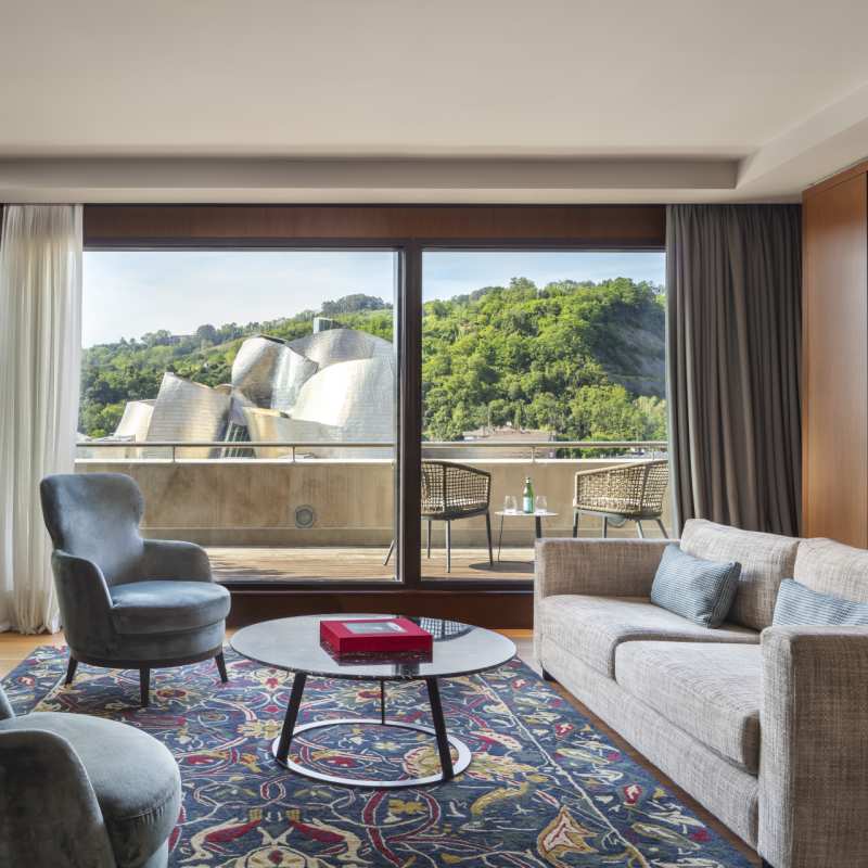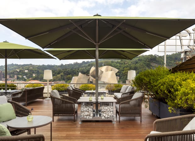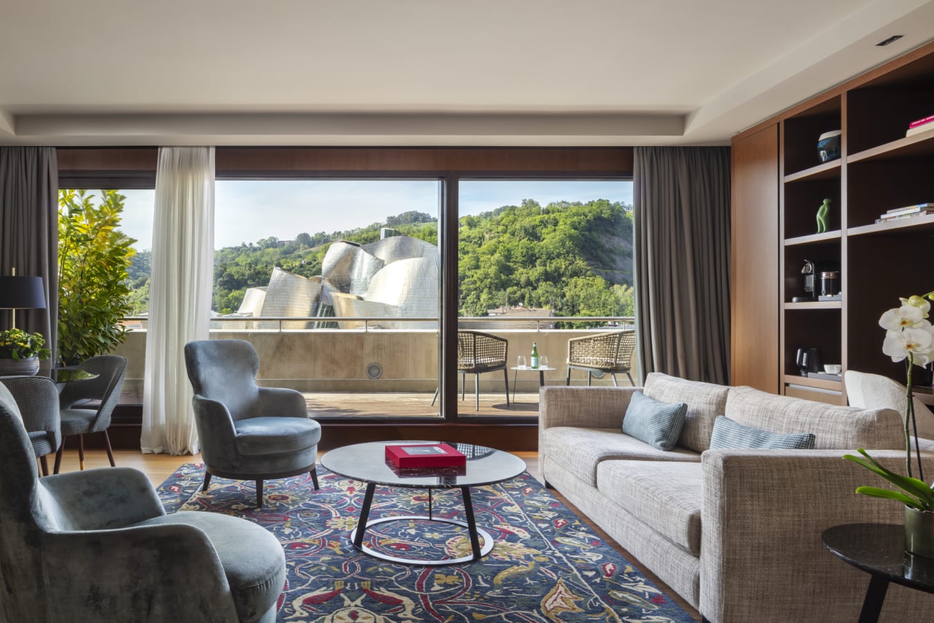 The rooms are contemporary in style, inspired by the Guggenheim, and 54 of these boast views of the museum from the expansive windows. The other rooms have city views, some with a terrace, and a number have Philippe Stark-designed bathtubs and White Company amenities. Crisp, white cotton linens and bright accent colors create a welcoming space to relax after a day exploring Bilbao’s many attractions.