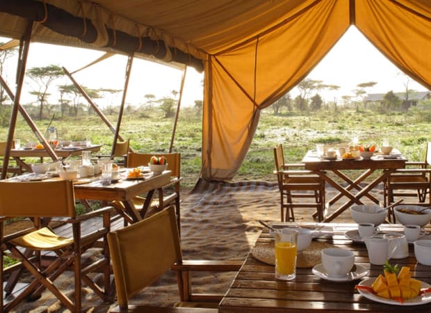 Serengeti Under Canvas offers two luxury mobile camps which roam the Serengeti plains and beyond, following the wildebeest as they migrate. Each semi-permanent camp has nine Meru style tents all with elegant finishes of Persian rugs and chandeliers.