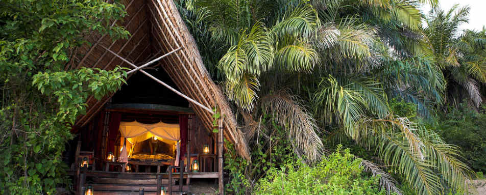 After landing at the airstrip, guests are transferred by boat to camp and welcomed into the main bar and dining area. The accommodation has been designed with flair and is made up of six wildly exotic wooden bandas looking out across the soft sand beach, their interiors fashioned from seasoned dhow timber. Each banda is open-fronted, with dressing room, adjoining bathroom and upstairs chill-out deck. With no roads for miles and miles, everything is done by foot or by boat. And if a day’s ’chimping’ isn’t enough, you can kayak along the lake shore, snorkel, fish (on a catch and release basis), or have a private barefoot dinner on the beach. The bar on the rocks is the perfect place to enjoy endless sundowners over the lake.