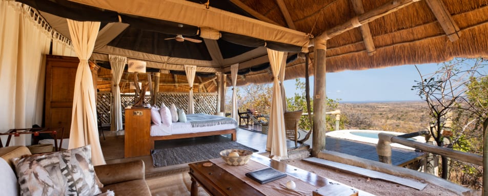 The camp's swimming pool offers incredible views across the savannah, and is the perfect place to relax after a day on safari