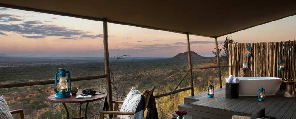 The 15 tented suites sit away from each other, sprinkled between the baobab and acacia trees that dot the escarpment, offering a degree of privacy with breathtaking views over the valley. Vaulted ceilings, a muted color scheme and floor-to-ceiling windows create an airy, light interior that’s dominated by a large four-poster bed draped in delicate nets. Light wooden furniture and rattan lampshades create a calming sanctuary, while the outside is equally tranquil with an outside bath sitting on the private decking.