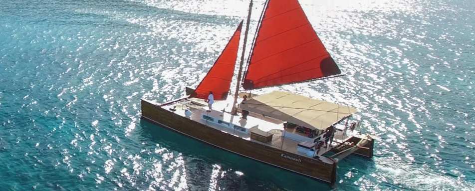 Today, you will embark on an enriching, interactive cultural sailing charter aboard a traditional Polynesian wa'a kaulua-an all wood, double-hulled sailing canoe. Your vessel was originally built by the king of Tonga and has since been modernized with a restroom for more comfortable use.