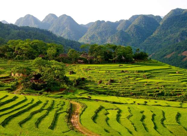 After lunch, the afternoon goes to Hoa Lu, Vietnam's first imperial capital, predating Hanoi's own prominence. The ruins of the Dinh and Le dynasties are fragmentary but evocative, and there's the option to climb into the karst hills above for the view. For those who'd rather stay at ground level, a bike ride through rice fields and past the cave pagodas of Bich Dong, three temples dating to 1428, reached by two hundred steps, offers the same countryside at a gentler pace. Back in Hanoi by early evening.Where to stay