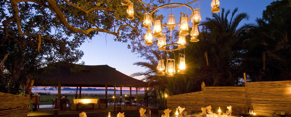 Busanga is a unique and authentic safari camp hidden away on an island overlooking the Busanga Plains. The Busanga Plains are seasonal floodplains that extend all the way to the horizon, allowing for uninterrupted views and amazing sunrises and sunsets. The plains are dotted with small 'islands' which are dominated by the Wild Fig and Date trees. The lounge and bar area is under canvas and set back slightly from the main tent is the dining area, which is set under a canopy of trees and is lit up at night by a stunning chandelier.