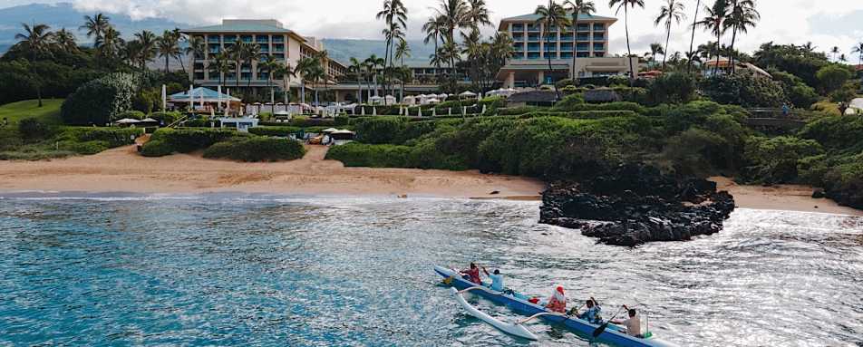 The hotel’s 380 spacious rooms and suites, located in a U-shaped building fronting the ocean, are decorated in tones of blue, coral, and gold, with koa wood furniture, luxury bedding and deep soaking tubs with L'Occitane bath amenities. Each room has the facilities you might expect from a serious five-star property, and the outdoor terraces, nearly all with ocean views, are great for watching sunsets year round and, in winter, migrating humpback whales.