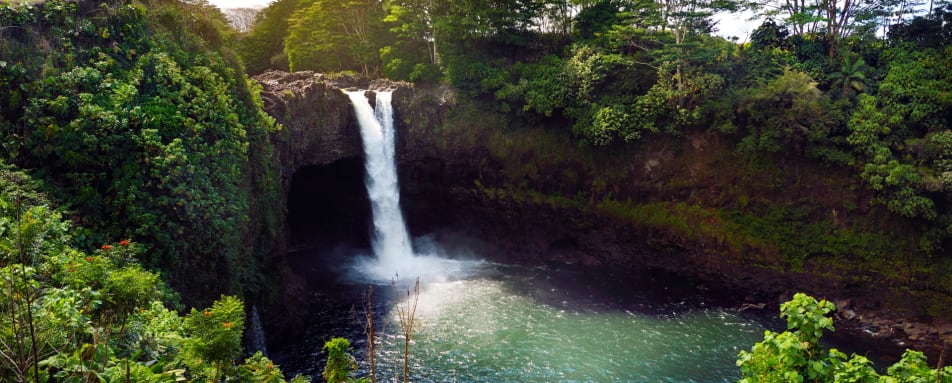 The afternoon is filled with visits to some of the most majestic waterfalls on the Big Island. First, Akaka Falls. This towering 442-foot (135-meter) waterfall plummets into a lush ravine at the center of a state park. You'll enjoy a short walk through the vegetation for an up-close view and plenty of photo opportunities. The next stop is a waterfall that's small by comparison, but not by beauty: Rainbow Falls, a beautiful 80-foot (24-meter) waterfall with a giant banyan tree beside it. Continuing on the drive along the Hamakua Coast, more postcard-worthy views will pass by your window, ushering you to the next destination, the sunset views will stop you in your tracks at the Waipio Valley lookout, where a dramatic backdrop of verdant cliffs drops into the sparkling blue ocean.
