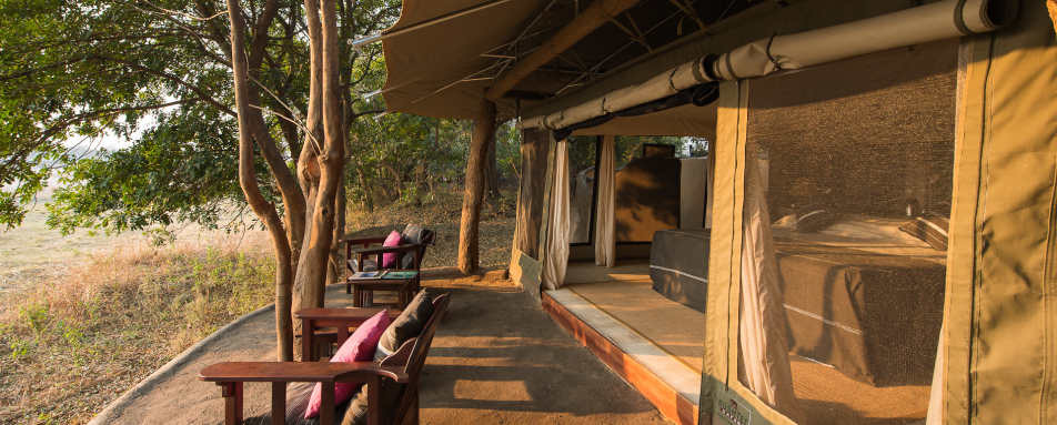 Tena Tena is owned and run by Robin Pope Safaris who were among the first to operate safaris in this area. The camp is small and exclusive, set in the shade of a mahogany grove. The six large tents are beautifully furnished and all look on to the waterhole which provides endless game viewing. The decor of the camp is decidedly Middle Eastern, with Persian rugs, hand-dyed Indian cotton bedspreads and Bedouin-style cushions. Open bathrooms are made of woven bamboo and joined to the tents by a large grass archway. One side of the tent rolls up completely, allowing guests to relax in the privacy of their own veranda, positioned to incorporate stunning views of either the river or the waterhole. The thatched dining room and bar are the perfect place to watch the elephants, hippos and antelopes on the banks of the mighty Luangwa River.